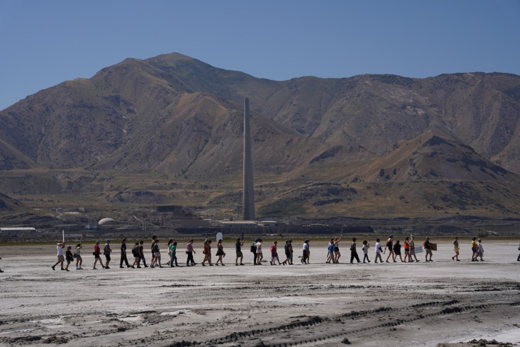 Protestors converged on the dry lake bed behind the Great Saltair, where local writer Milo Emilia read poetry from their recent book lake words. “Think of a place you know that is loved, cared for. Think of how that place feels and how you feel there,” they read. “Now think of a place that has been disregarded, put aside, and ignored. You can feel it. Has our great salt lake been disregarded? What love does it need to heal?”