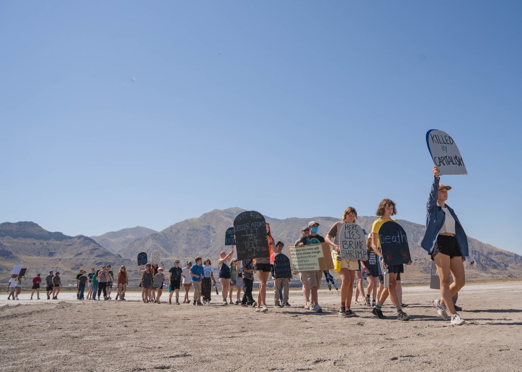 Demonstrators then marched in silence onto the lakebed, arriving at a “graveyard” comprising approximately 20 tombstones – each warning of harm that will befall communities in the Salt Lake Valley if the lake dries up.
